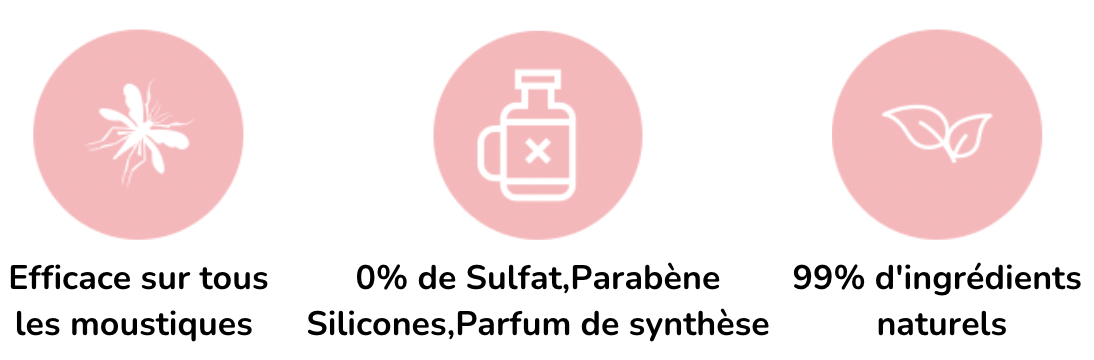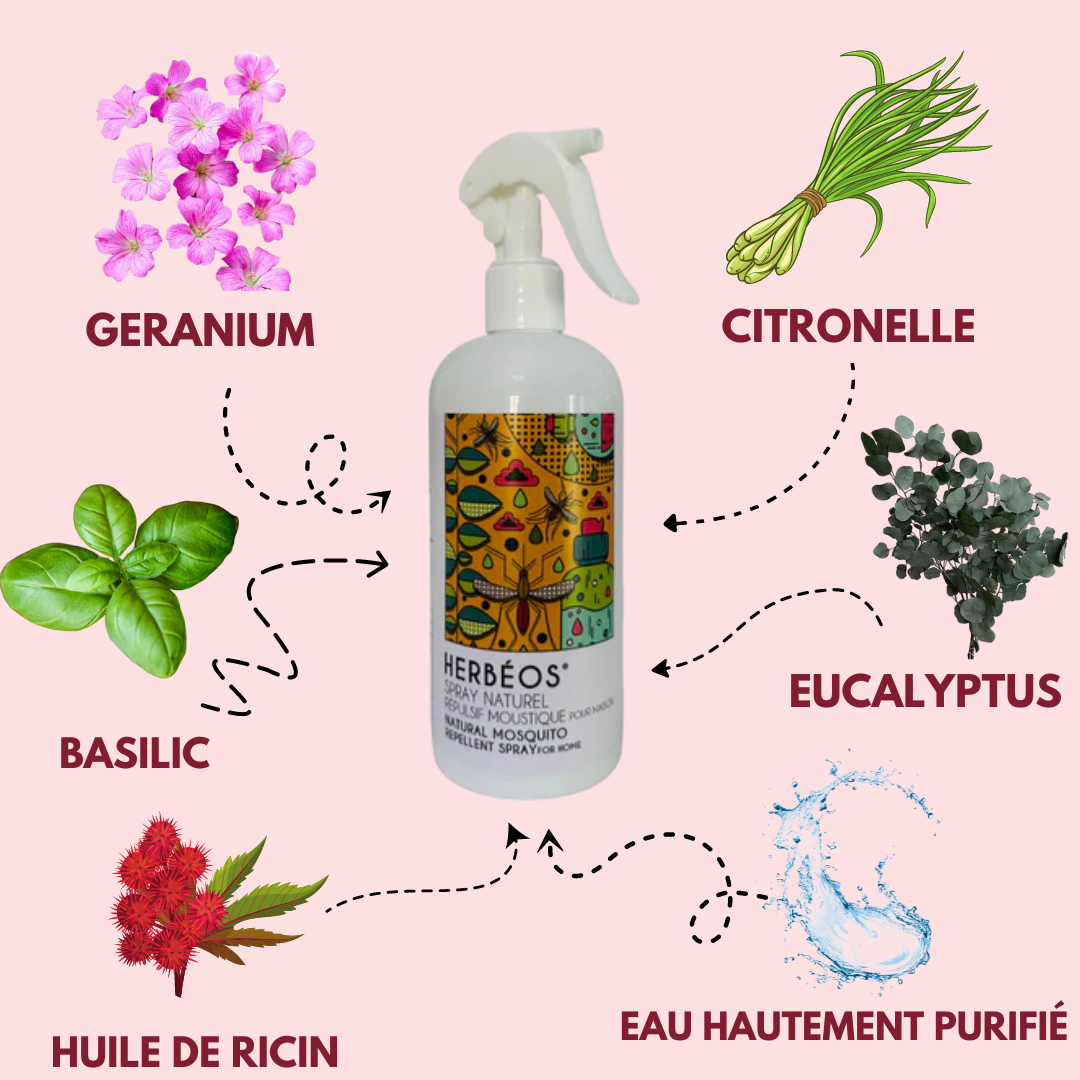 Ce spray est composé à 99% d'ingredient naturel tel que huile essentielle de citronnelle, huile essentielle de géranium, huile essentielle de basilic, huile essentielle d’eucalyptus citronnée, huile de ricin hydrogénée, conservateur autorisé dans le domaine Bio.